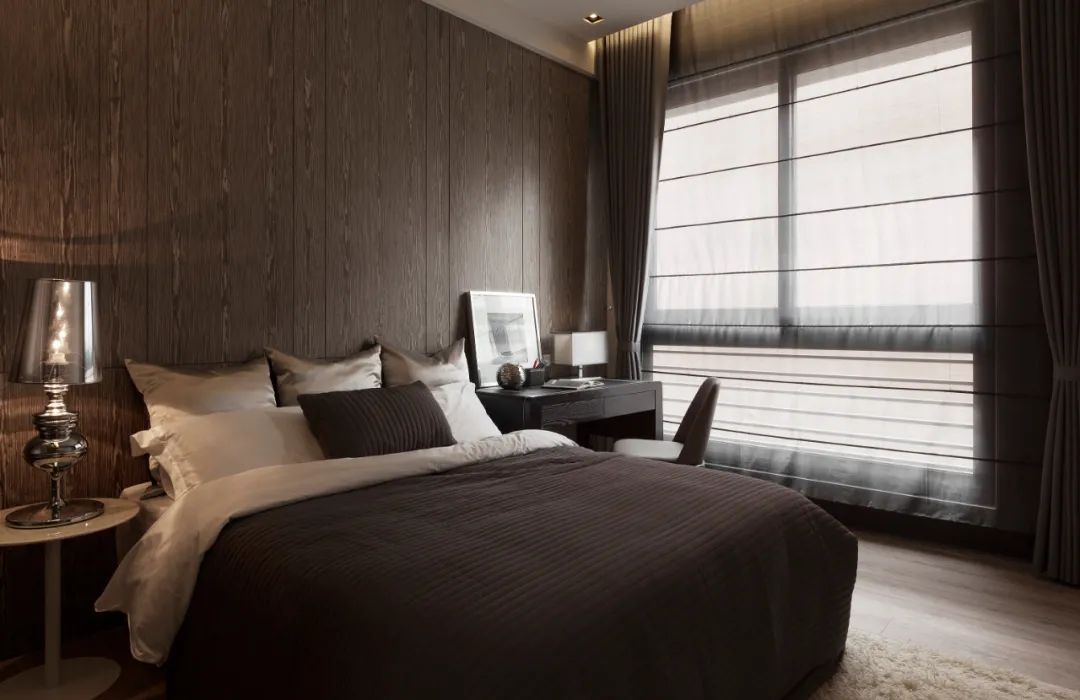 相比上一个卧室,这个卧室空间更显简约、明朗。深色的整体基调让空间更为沉稳。整洁、细细的蚕丝线纹浮于窗帘与被面上,空间简约而不失时尚,展示出居者高尚的品格。