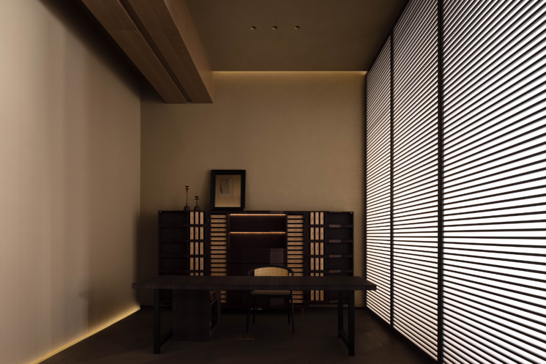承担着主要功能的服务岛台兼作聚会吧,满足日常的大型讲座会,或作新品发布酒会之用,觥筹交错,各种“声音的纹理”变得清晰、饱满起来。灵活闭合的转轴门,成为公区和私密区需要的可控开关,由喧闹转向静谧的所在。