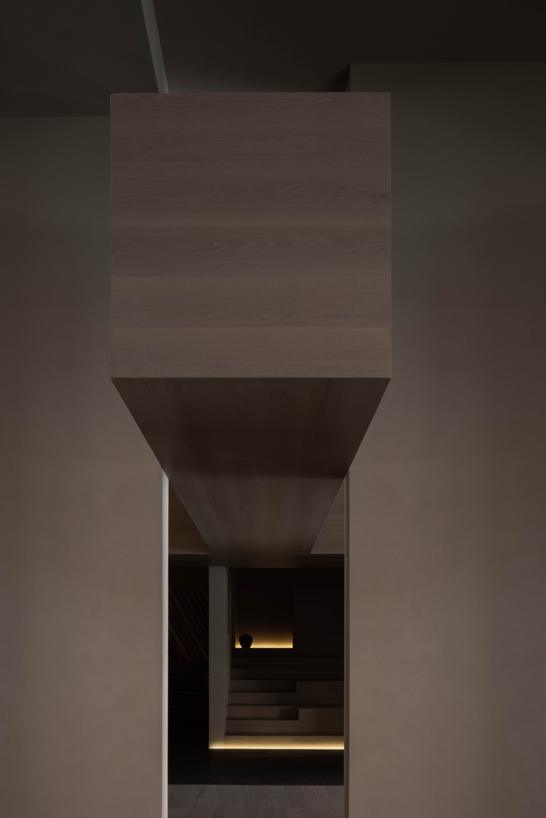 交叉的体块通过剖面的相互作用,空间彼此渗透,创造了垂直层面的视觉联动。“看与被看”随着步移景异而发生“主观和客观”的身份变化,深浅的光影渲染于此,使空间趋向于产品发布会的秀场,更具有戏剧性和体验感。