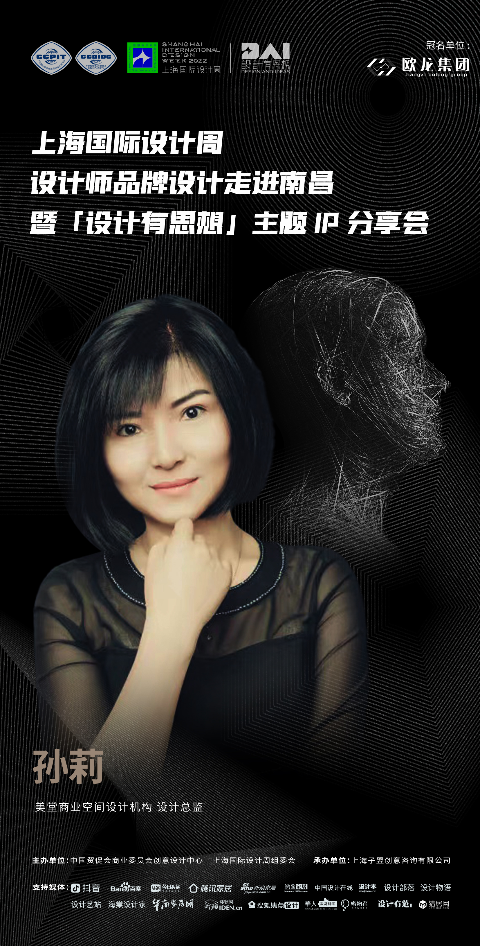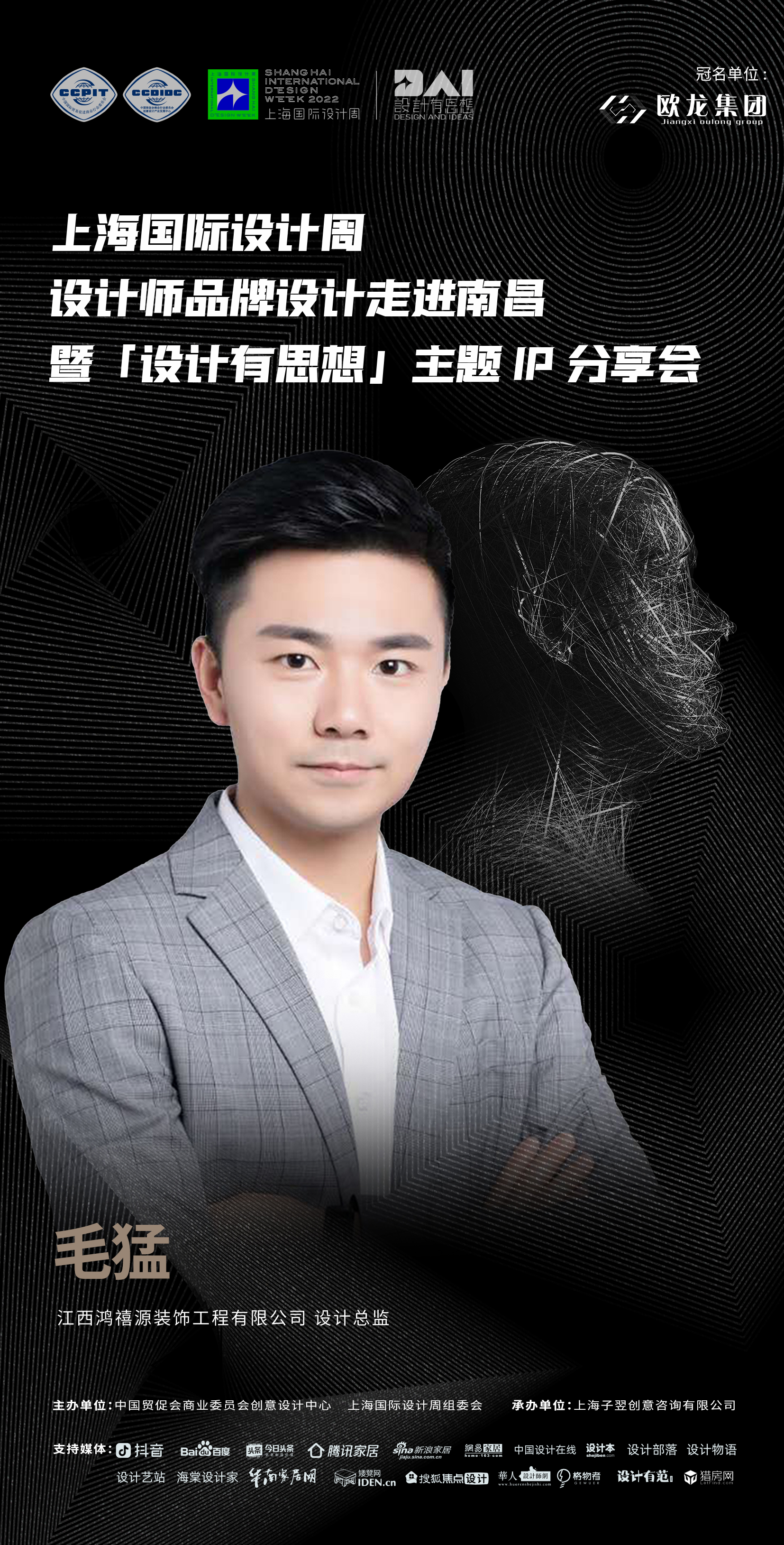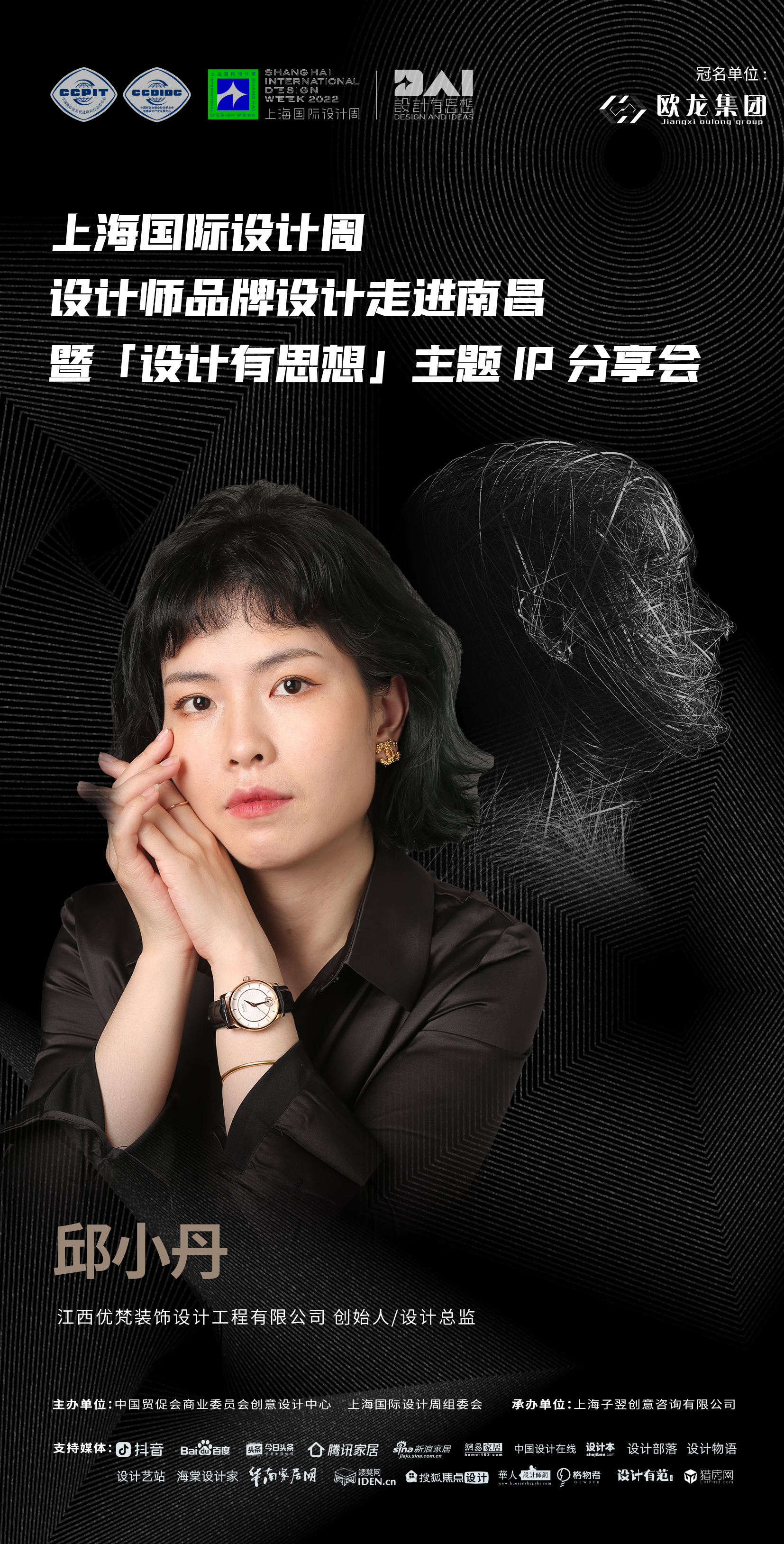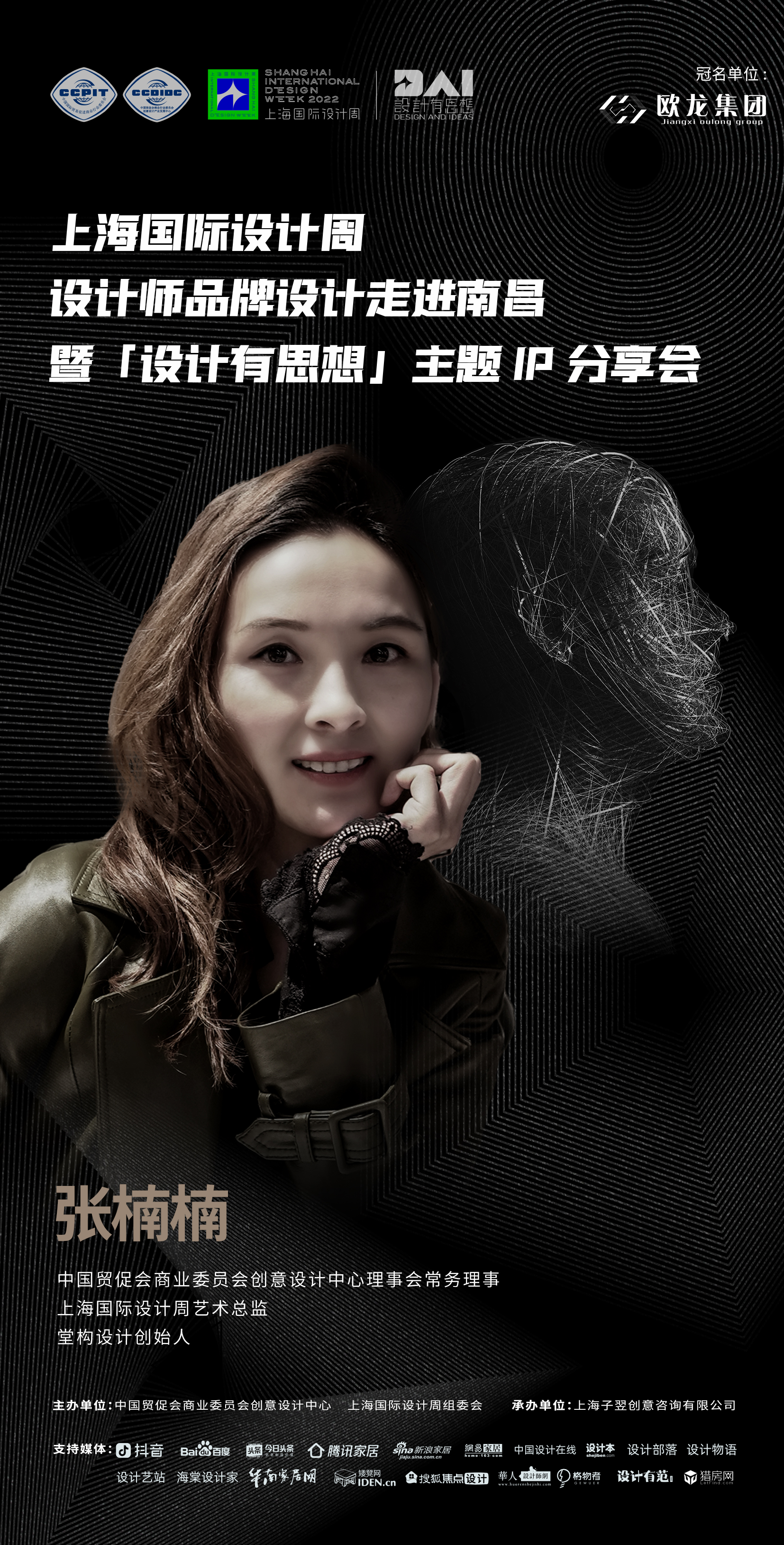 2022年9月7日,上海国际设计周设计师品牌设计走进南昌暨「设计有思想」主题IP分享会即将开启!本次活动由中国贸促会商业委员会、上海国际设计周组委会主办,上海子翌创意咨询有限公司承办,欧龙集团总冠名,获得抖音、百度、今日头条、腾讯家居、新浪家居、网易家居、搜狐焦点设计、中国设计在线、设计本、设计部落、设计物语、设计艺站、华人设计网、海棠设计家、华南家居网、矮凳网、格物者、设计有范、猎房网等媒体的大力支持。