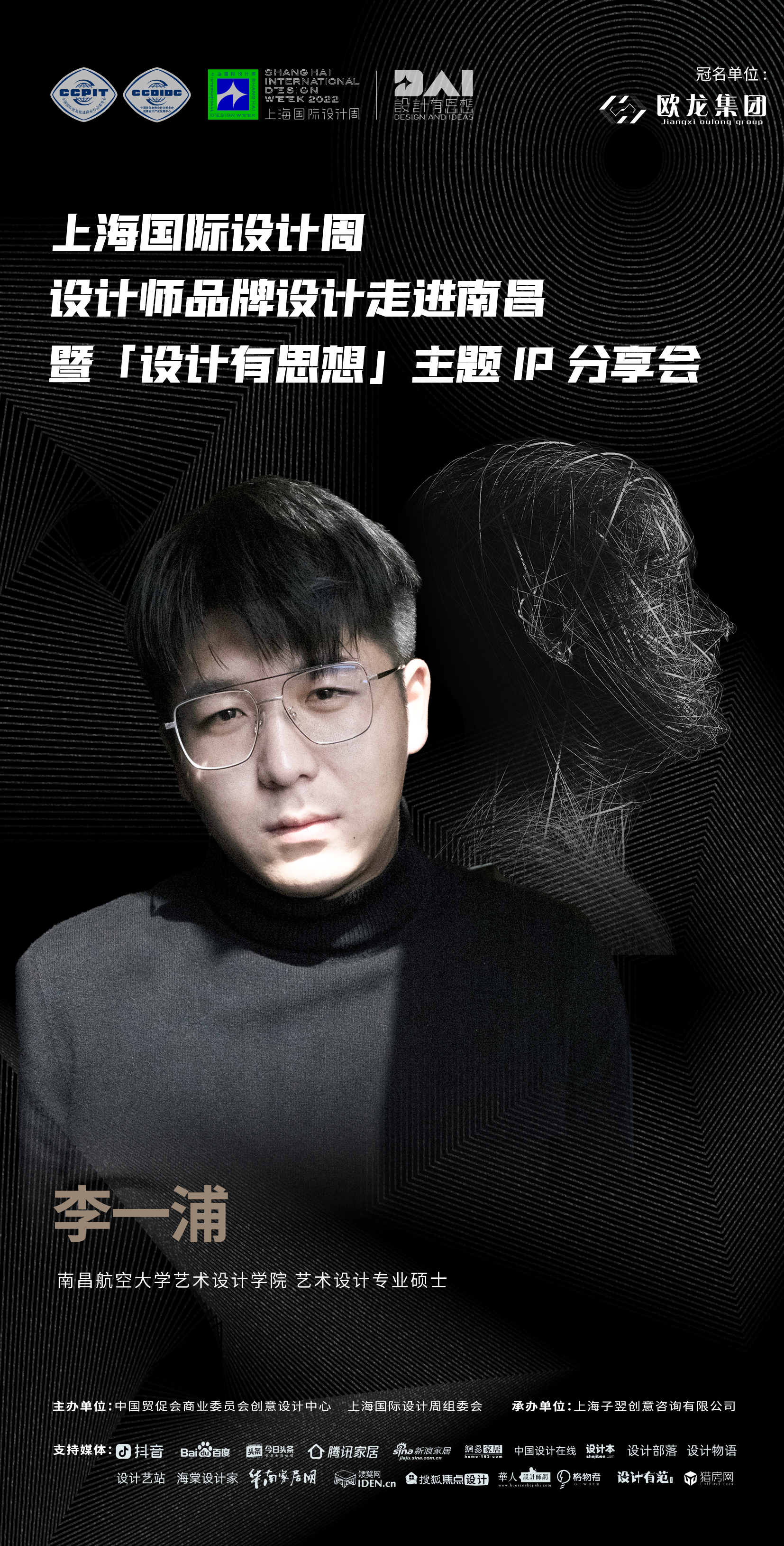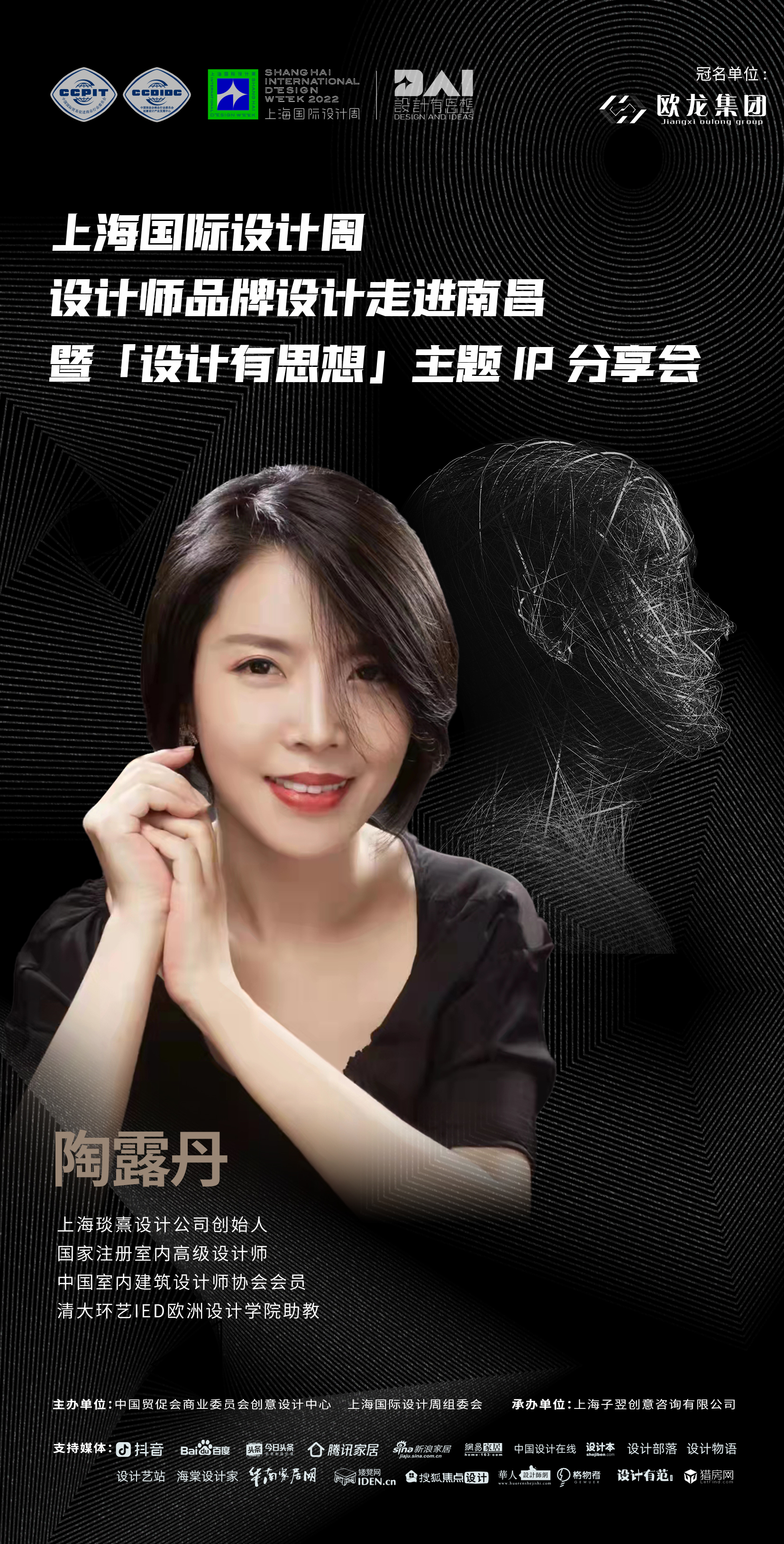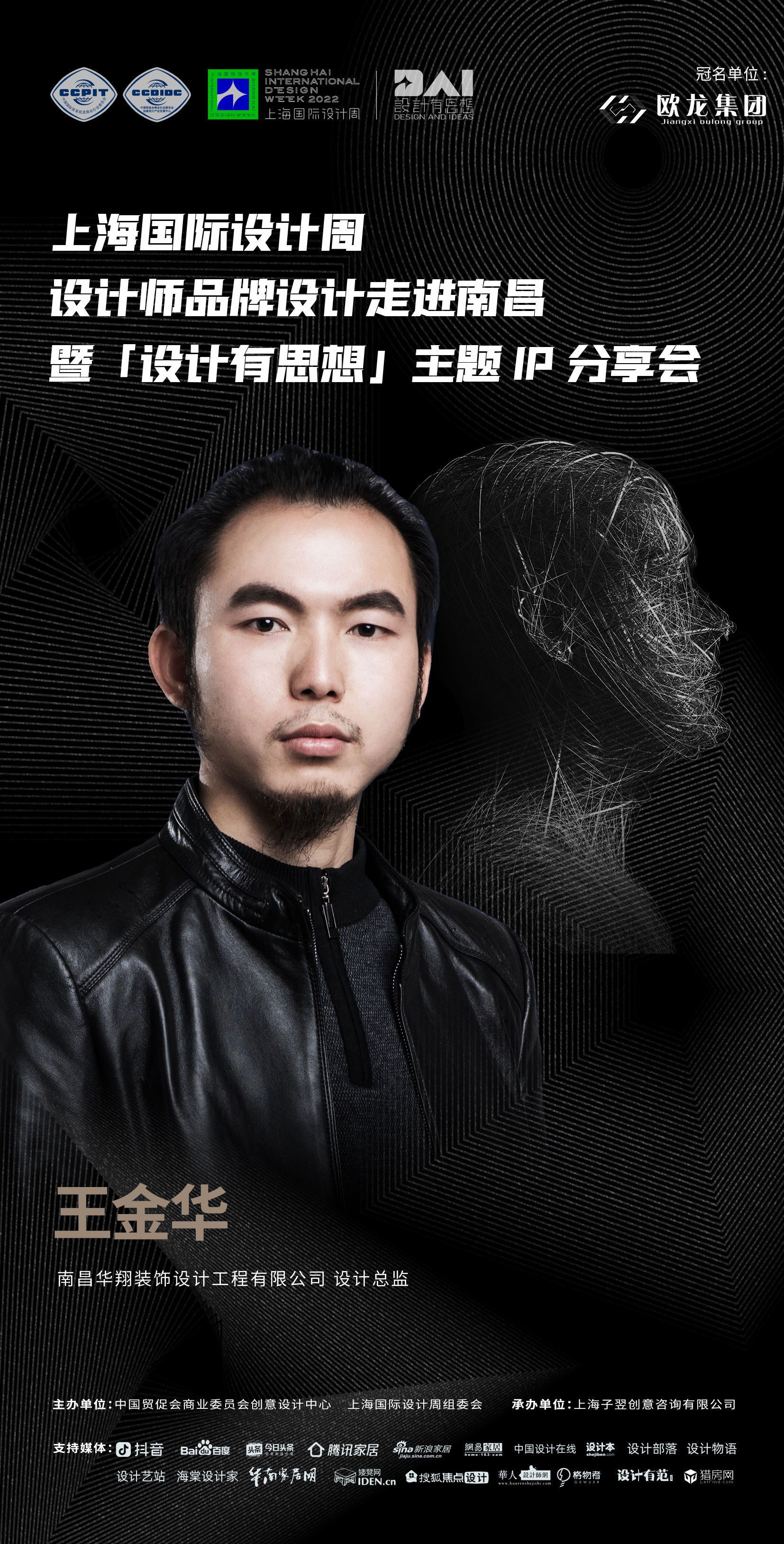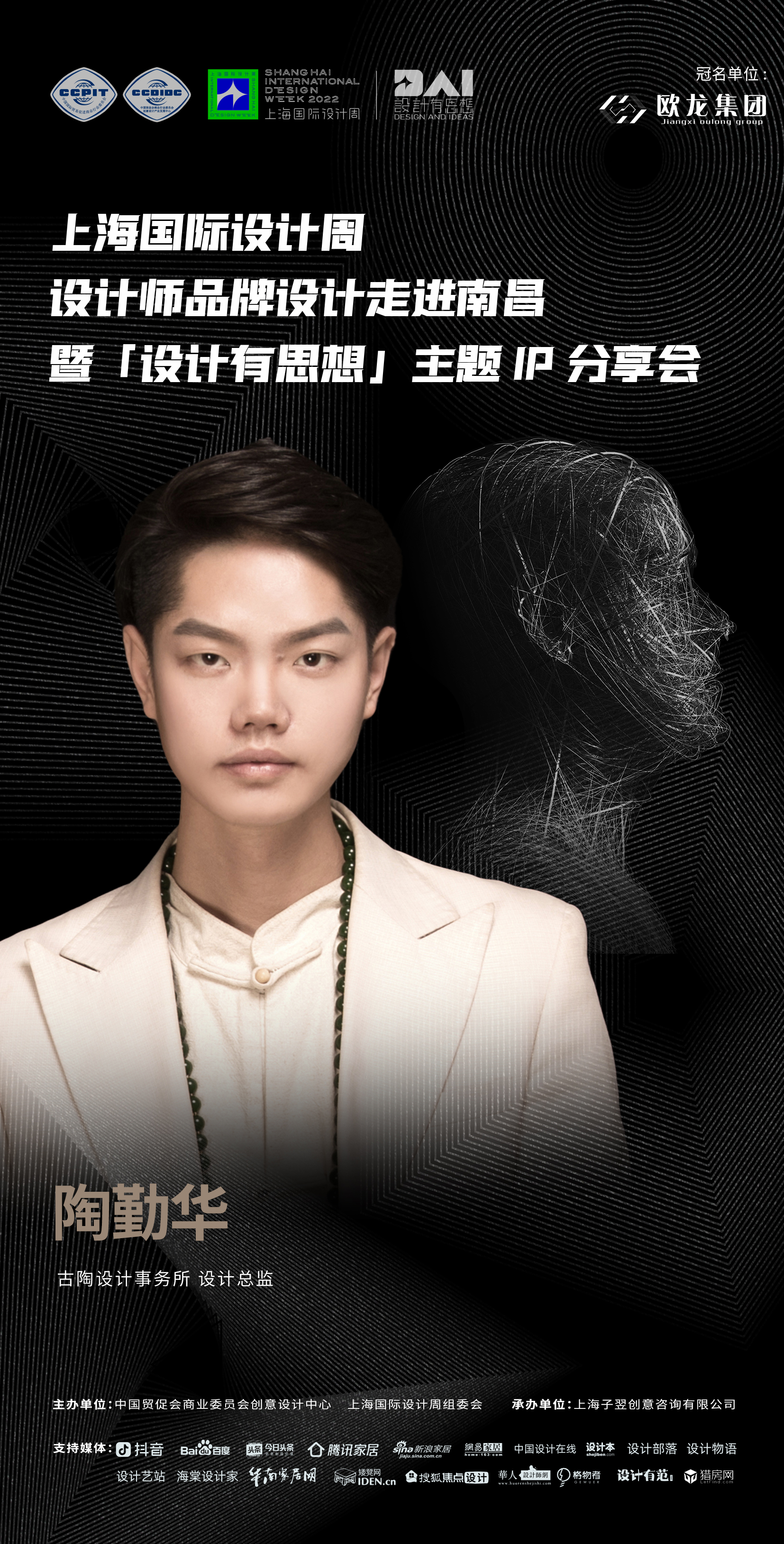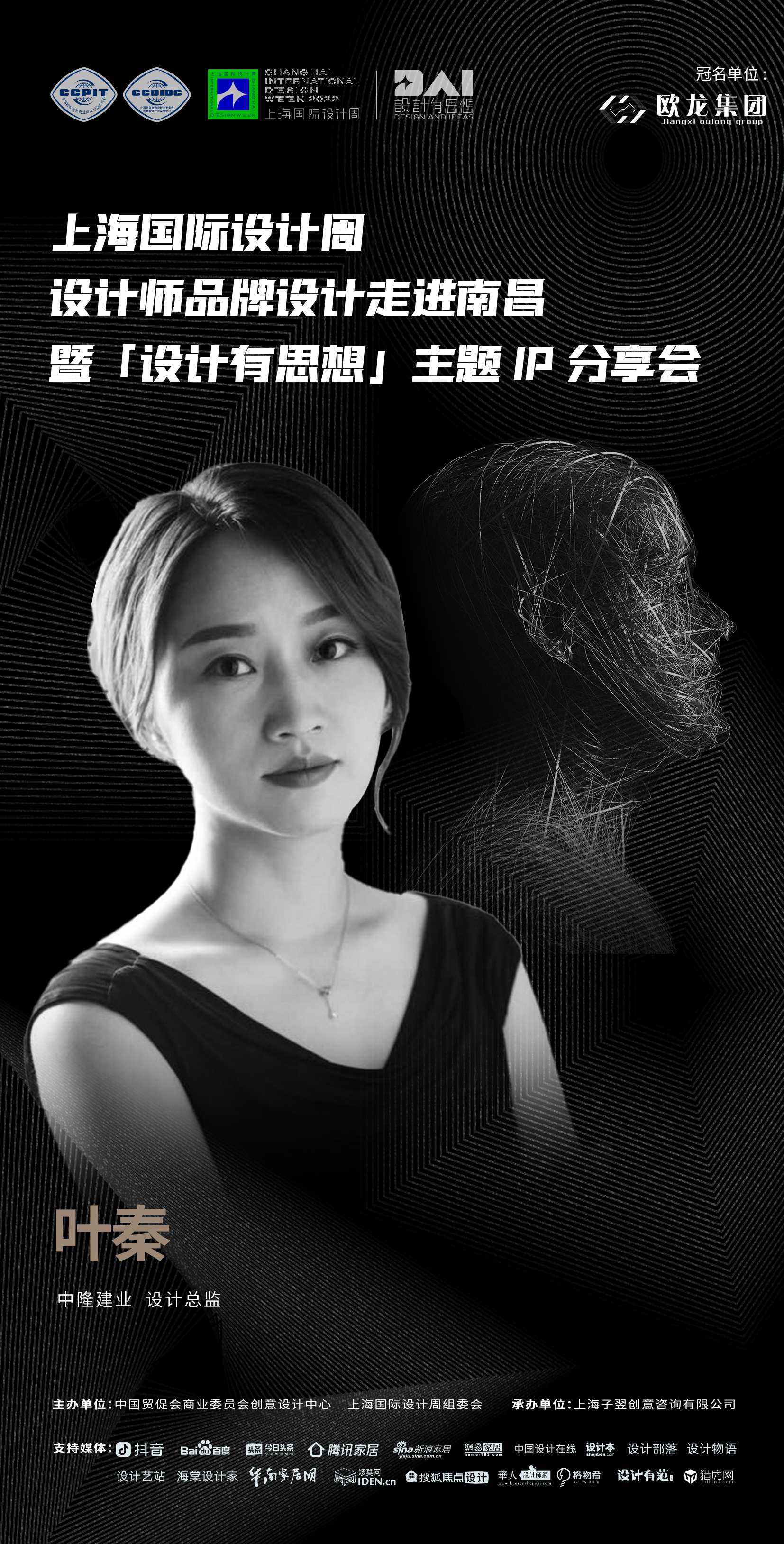 2022年9月7日,上海国际设计周设计师品牌设计走进南昌暨「设计有思想」主题IP分享会即将开启!本次活动由中国贸促会商业委员会、上海国际设计周组委会主办,上海子翌创意咨询有限公司承办,欧龙集团总冠名,获得抖音、百度、今日头条、腾讯家居、新浪家居、网易家居、搜狐焦点设计、中国设计在线、设计本、设计部落、设计物语、设计艺站、华人设计网、海棠设计家、华南家居网、矮凳网、格物者、设计有范、猎房网等媒体的大力支持。