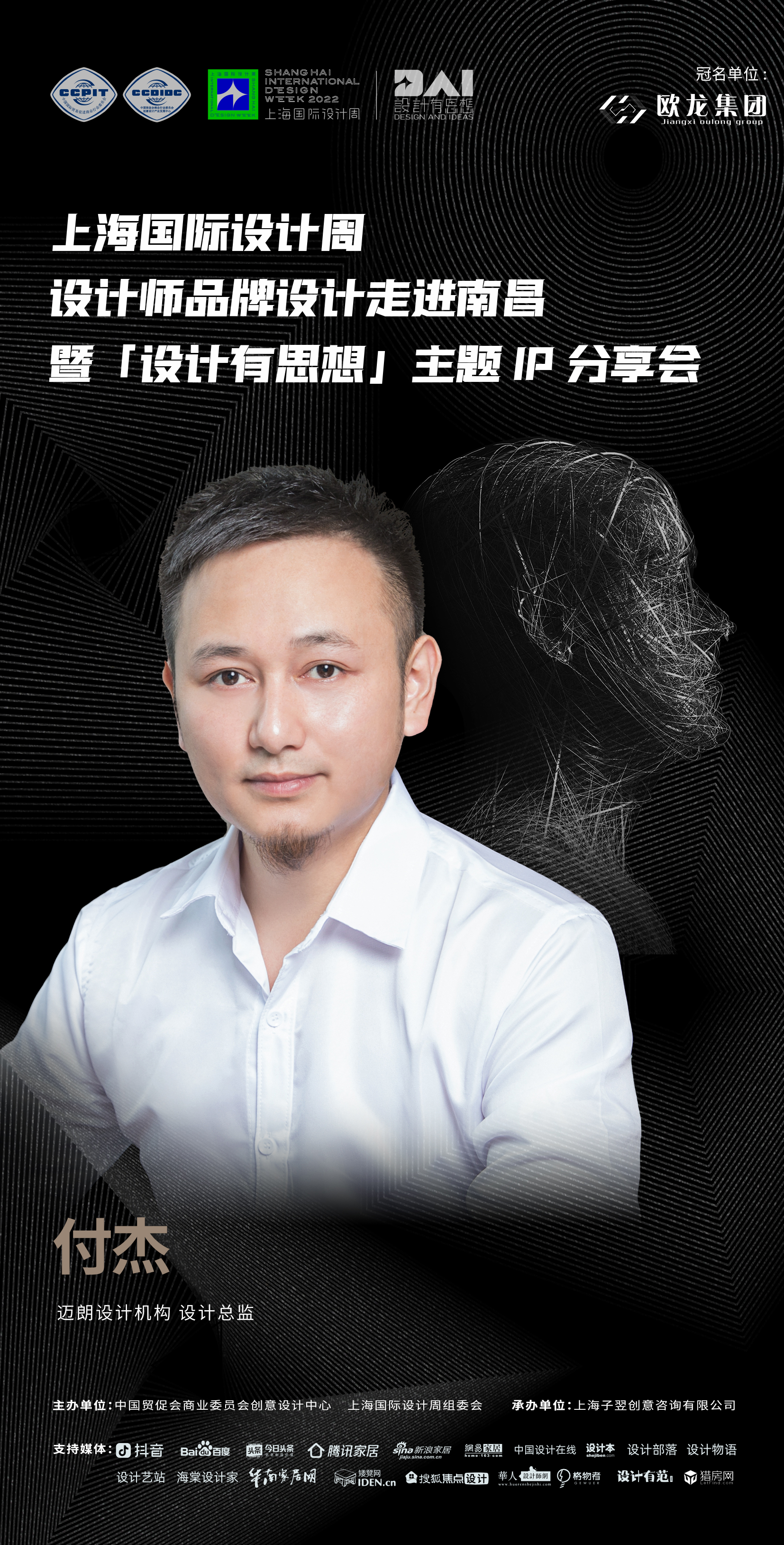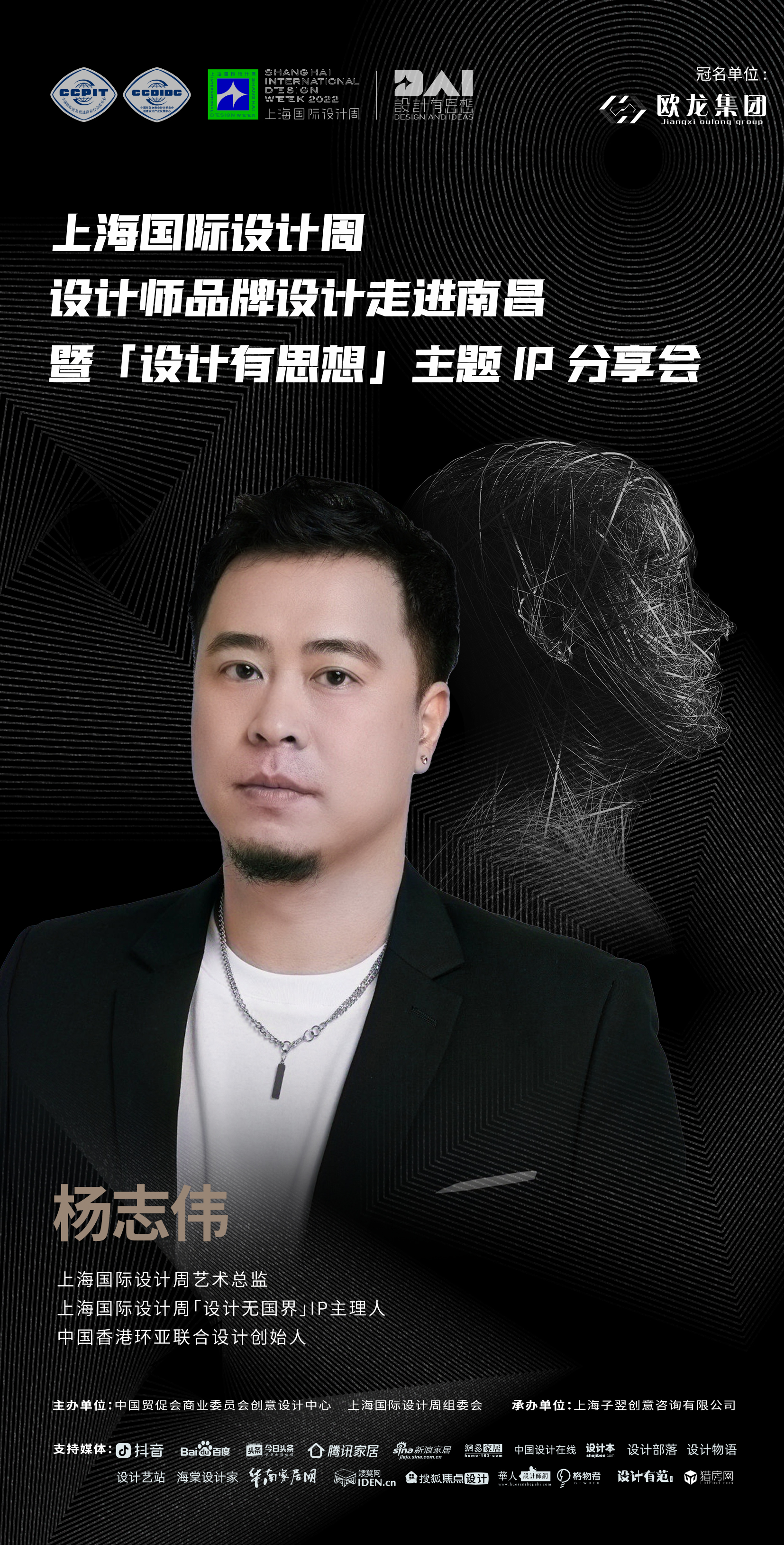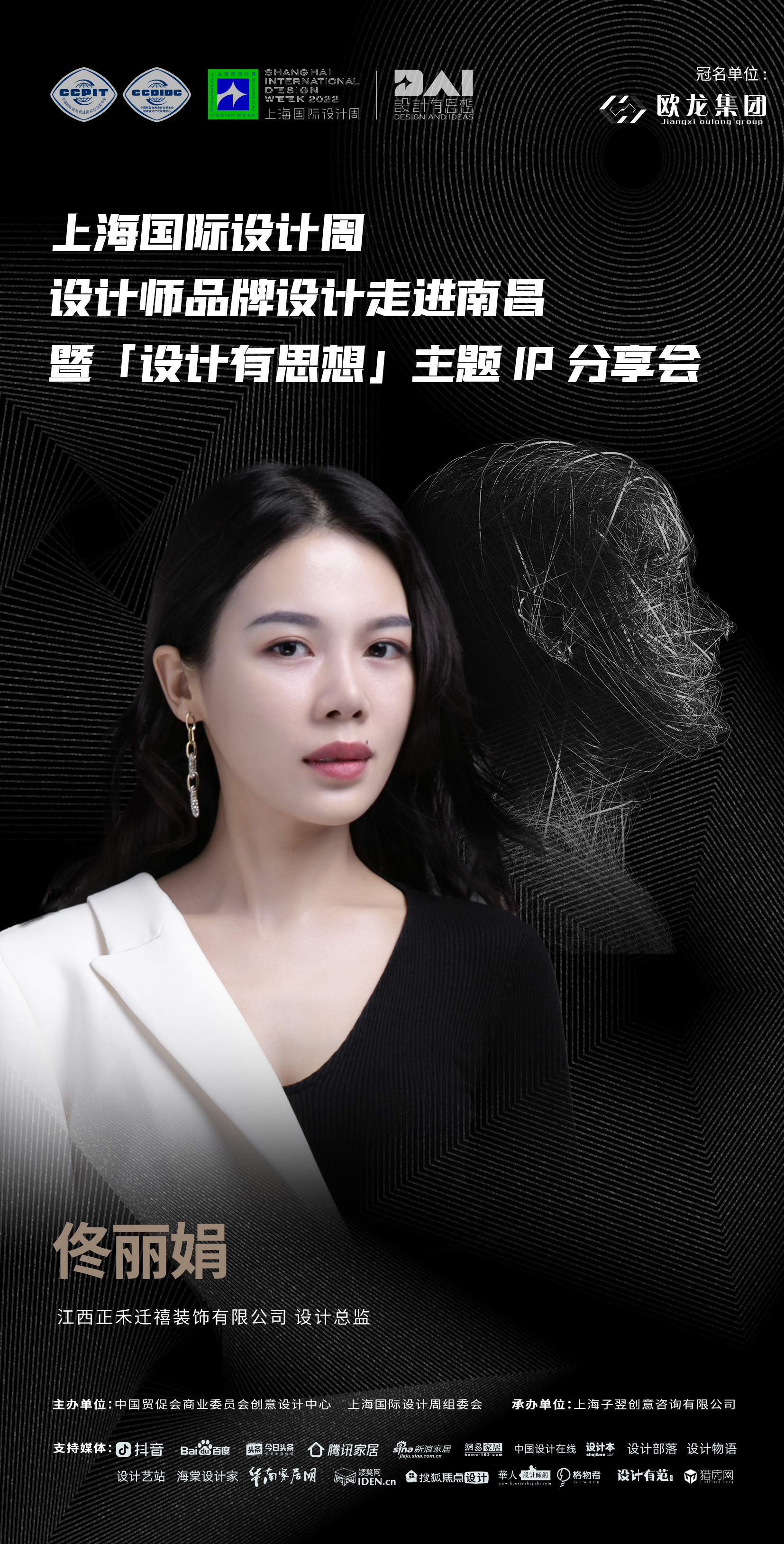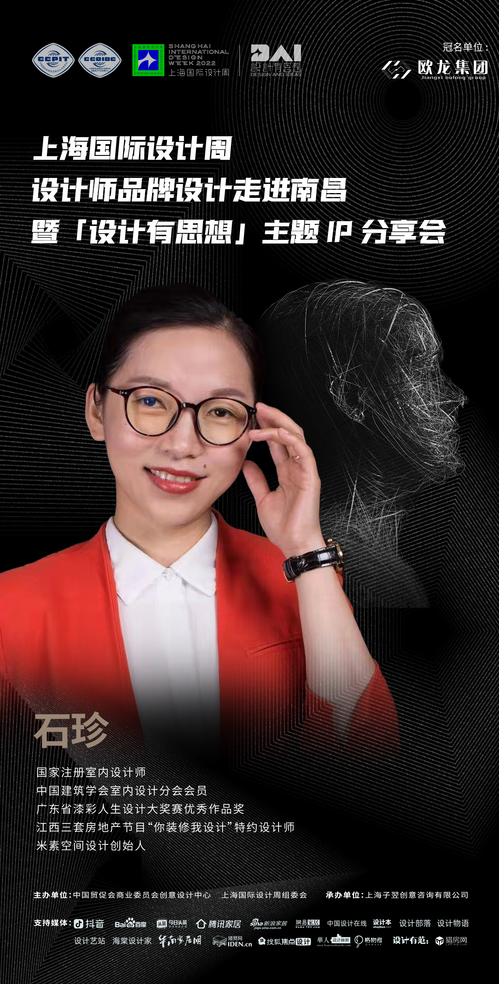 2022年9月7日,上海国际设计周设计师品牌设计走进南昌暨「设计有思想」主题IP分享会即将开启!本次活动由中国贸促会商业委员会、上海国际设计周组委会主办,上海子翌创意咨询有限公司承办,欧龙集团总冠名,获得抖音、百度、今日头条、腾讯家居、新浪家居、网易家居、搜狐焦点设计、中国设计在线、设计本、设计部落、设计物语、设计艺站、华人设计网、海棠设计家、华南家居网、矮凳网、格物者、设计有范、猎房网等媒体的大力支持。