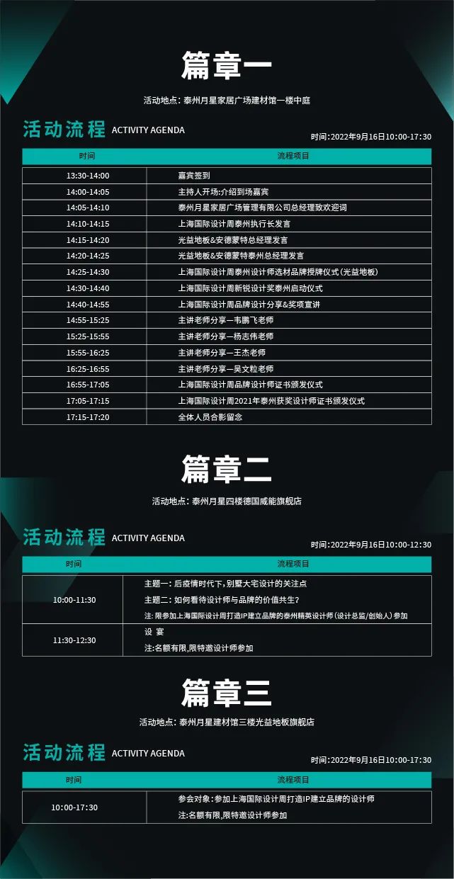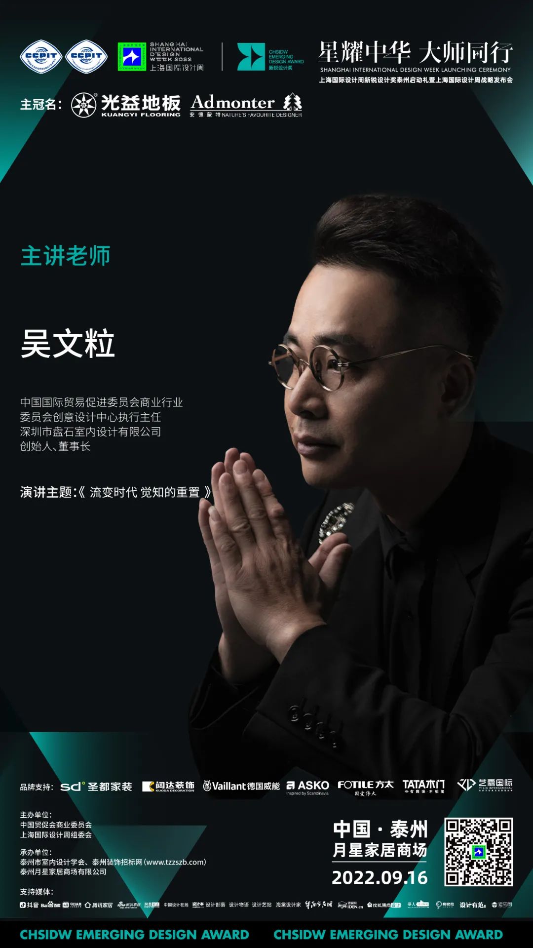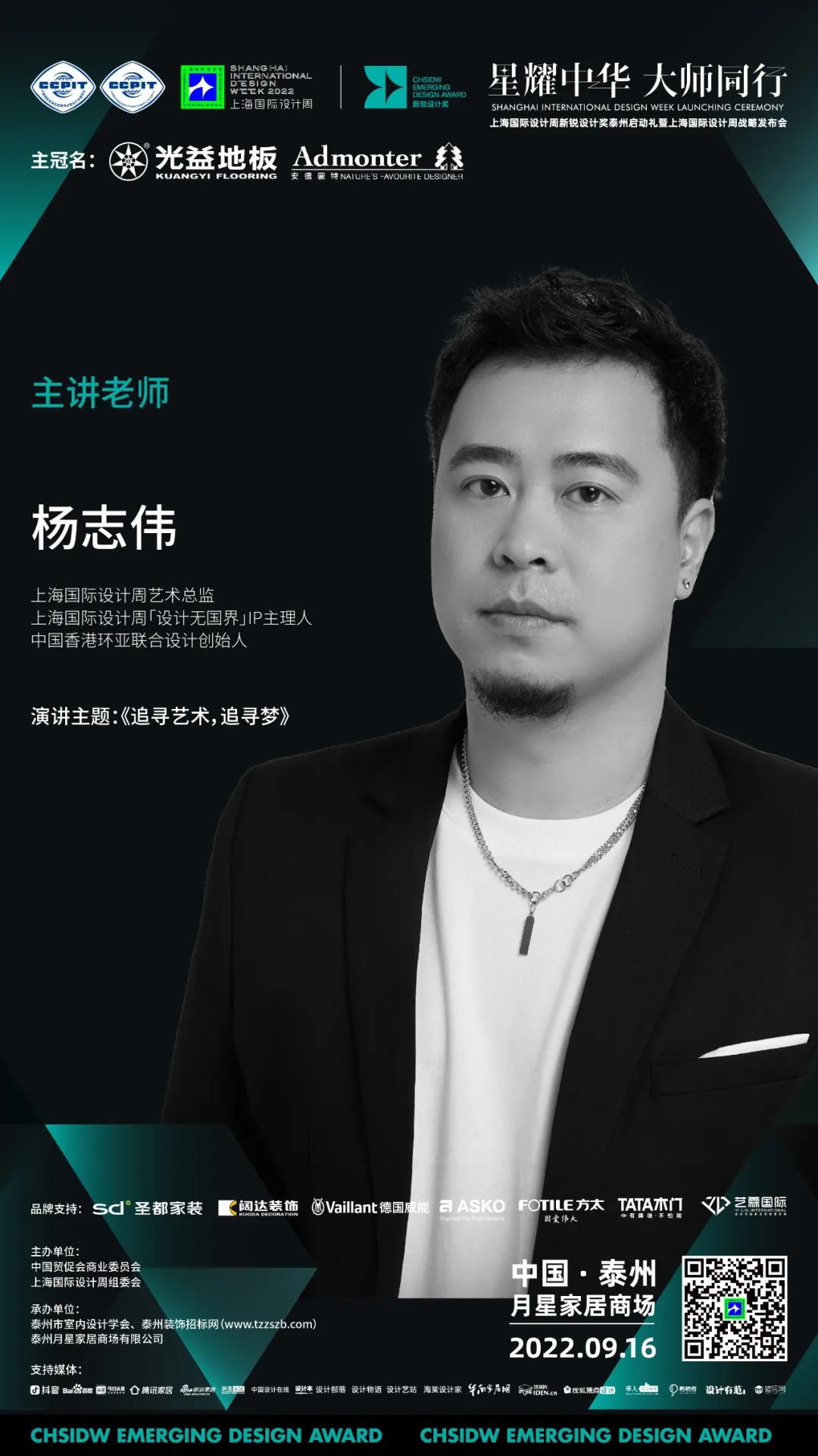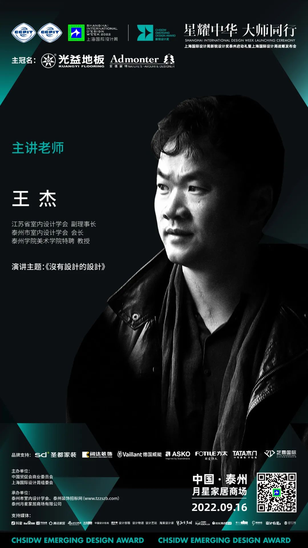 2022年9月16日,「星耀中华 大师同行」新锐设计奖泰州启动礼暨上海国际设计周战略发布会将于泰州月星家居商场举办。本次活动由中国贸促会商业委员会、上海国际设计周组委会主办,泰州装饰招标网、泰州市室内设计学会承办,泰州月星家居广场管理有限公司协办,光益地板、安德蒙特冠名,圣都装饰、阔达装饰、德国威能、ASKO、TATA木门、方太电器、艺霖国际特约支持。本次活动获得抖音、百度、今日头条、腾讯家居、新浪家居、网易家居、搜狐焦点设计、中国设计在线、设计本、设计部落、设计物语、设计艺站、华人设计网、海棠设计家、华南家居网、矮凳网、格物者、设计有范、猎房网等媒体的大力支持。