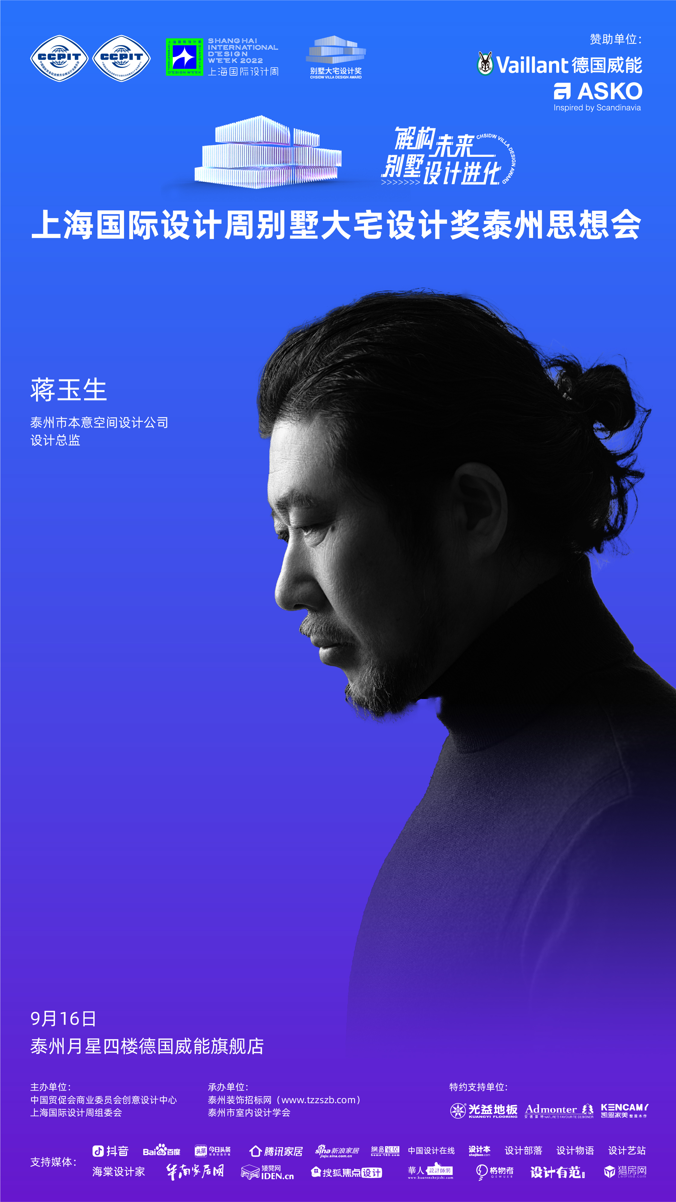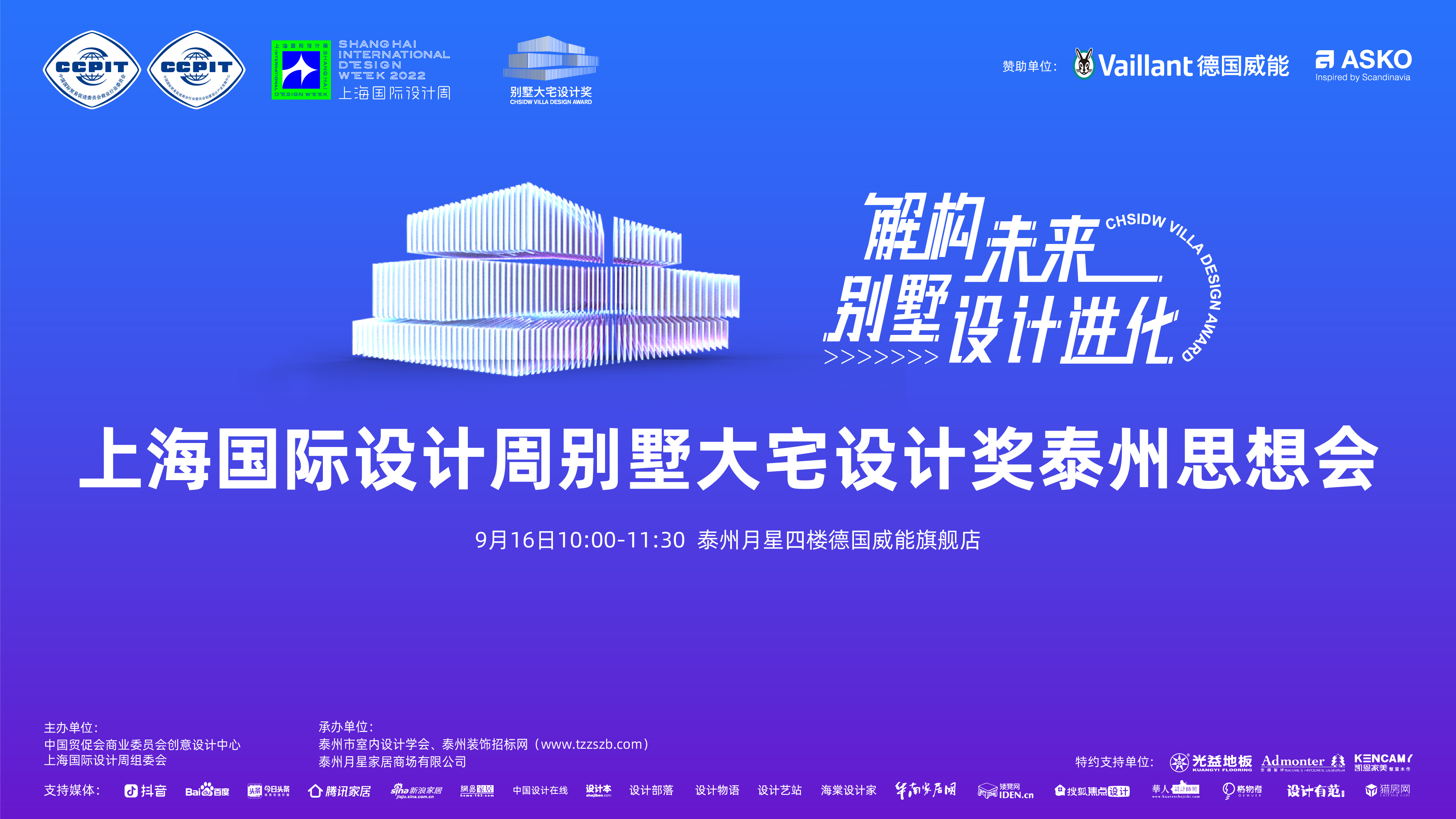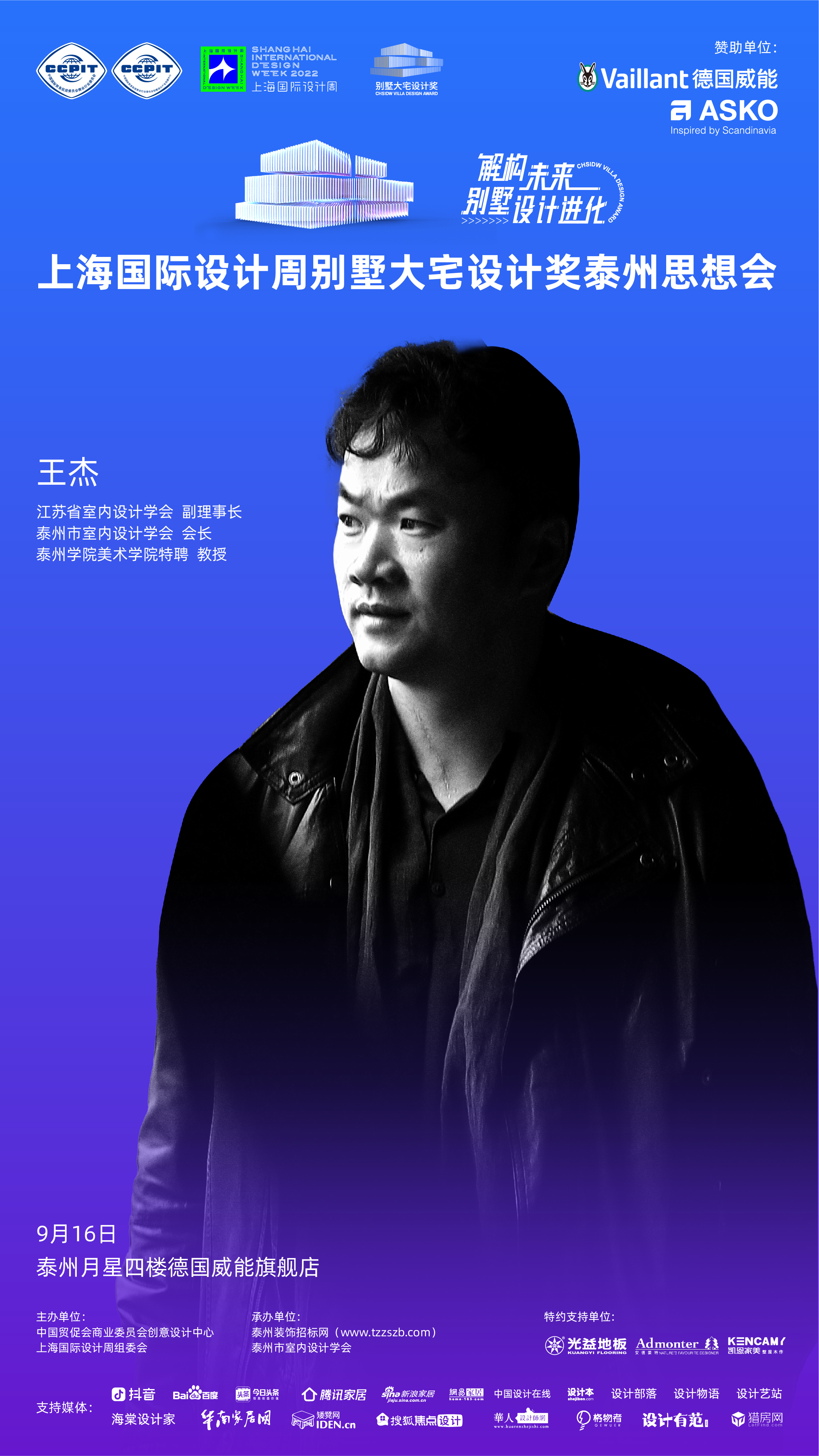 2022年9月16日,「解构未来别墅设计进化」上海国际设计周别墅大宅设计奖泰州思想会将于泰州月星四楼德国威能旗舰店盛大举办!本次活动由中国贸促会商业委员会创意设计中心、上海国际设计周组委会主办,泰州装饰招标网、泰州市室内设计学会承办,德国威能、ASKO赞助,光益地板、安德蒙特、凯恩家美定制特约支持,抖音、百度、今日头条、腾讯家居、新浪家居、网易家居、搜狐焦点设计、中国设计在线、设计本、设计部落、设计物语、设计艺站、海棠设计家、华南家居网、矮凳网、设计有范、猎房网等媒体支持。