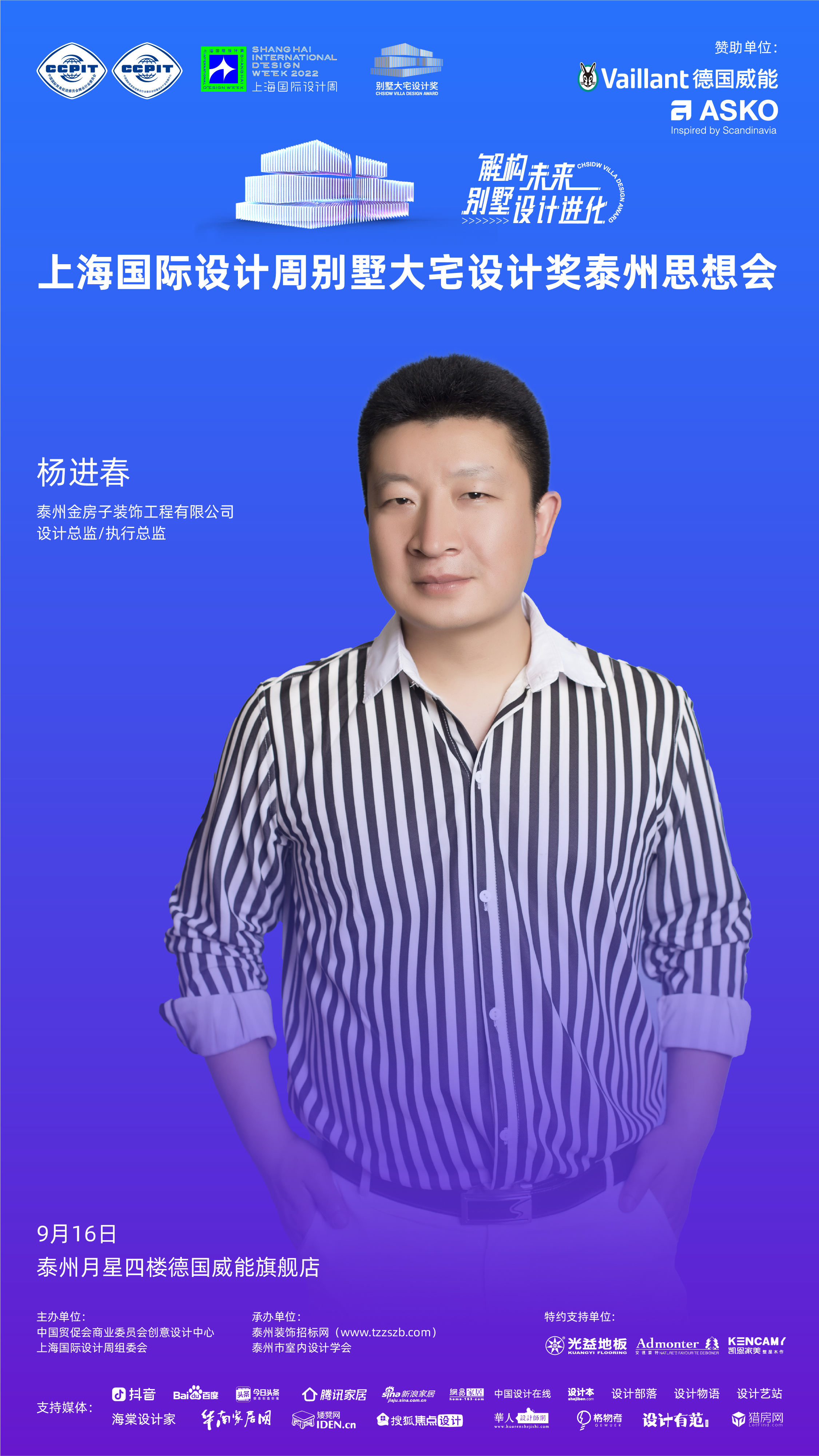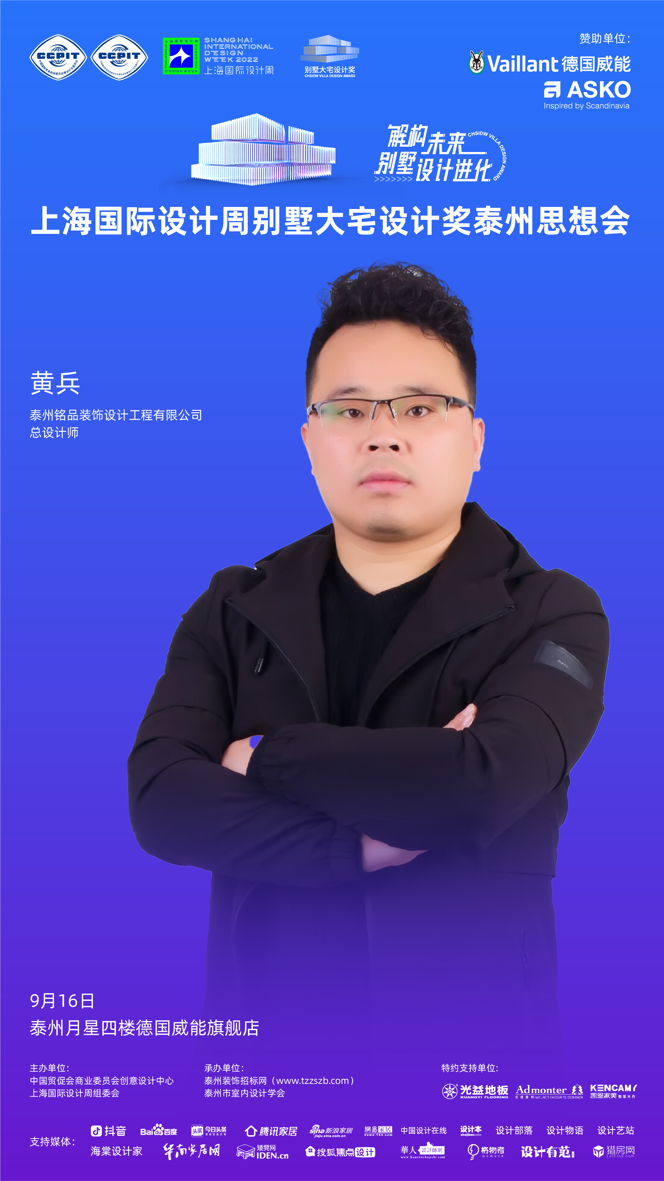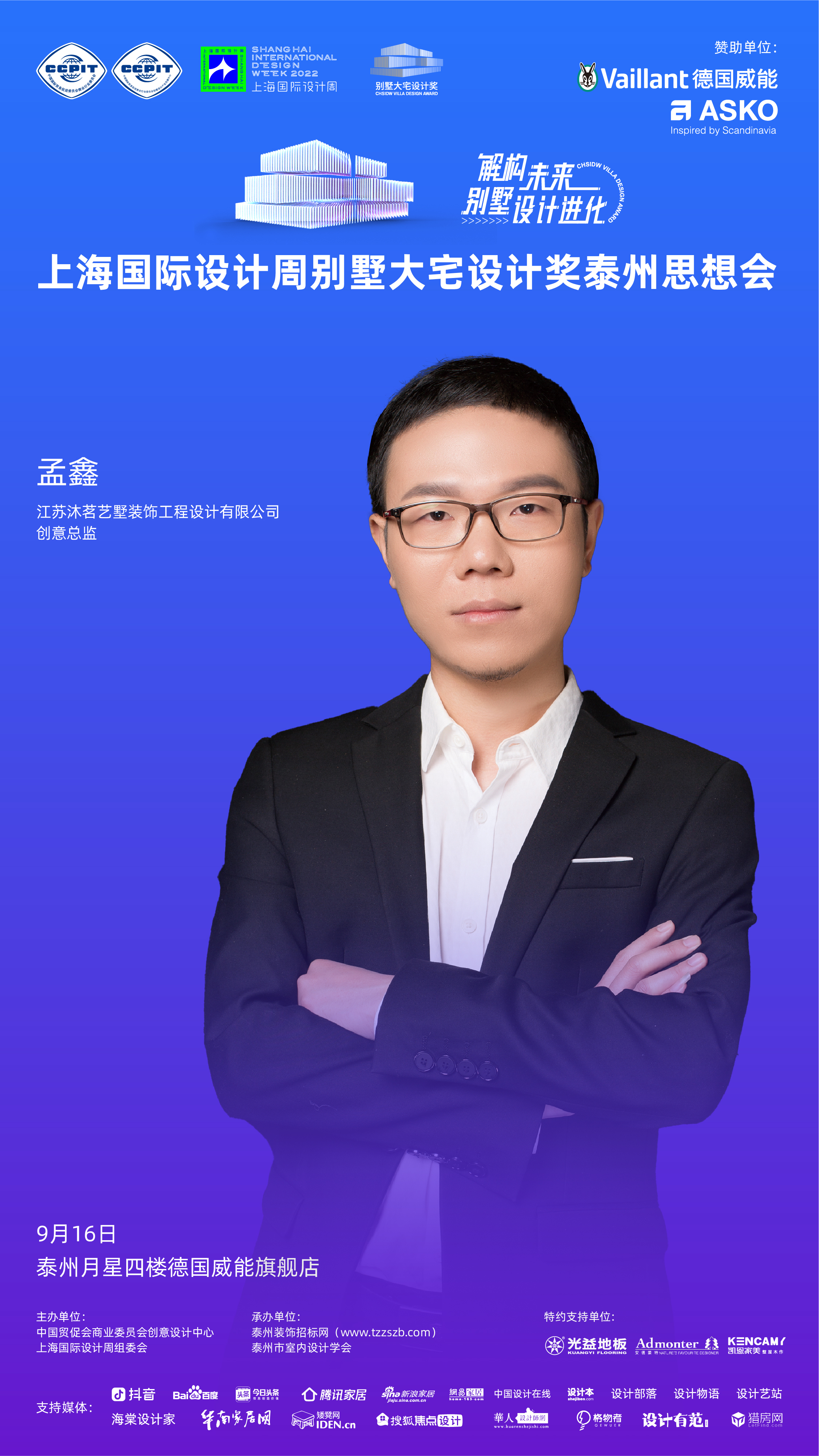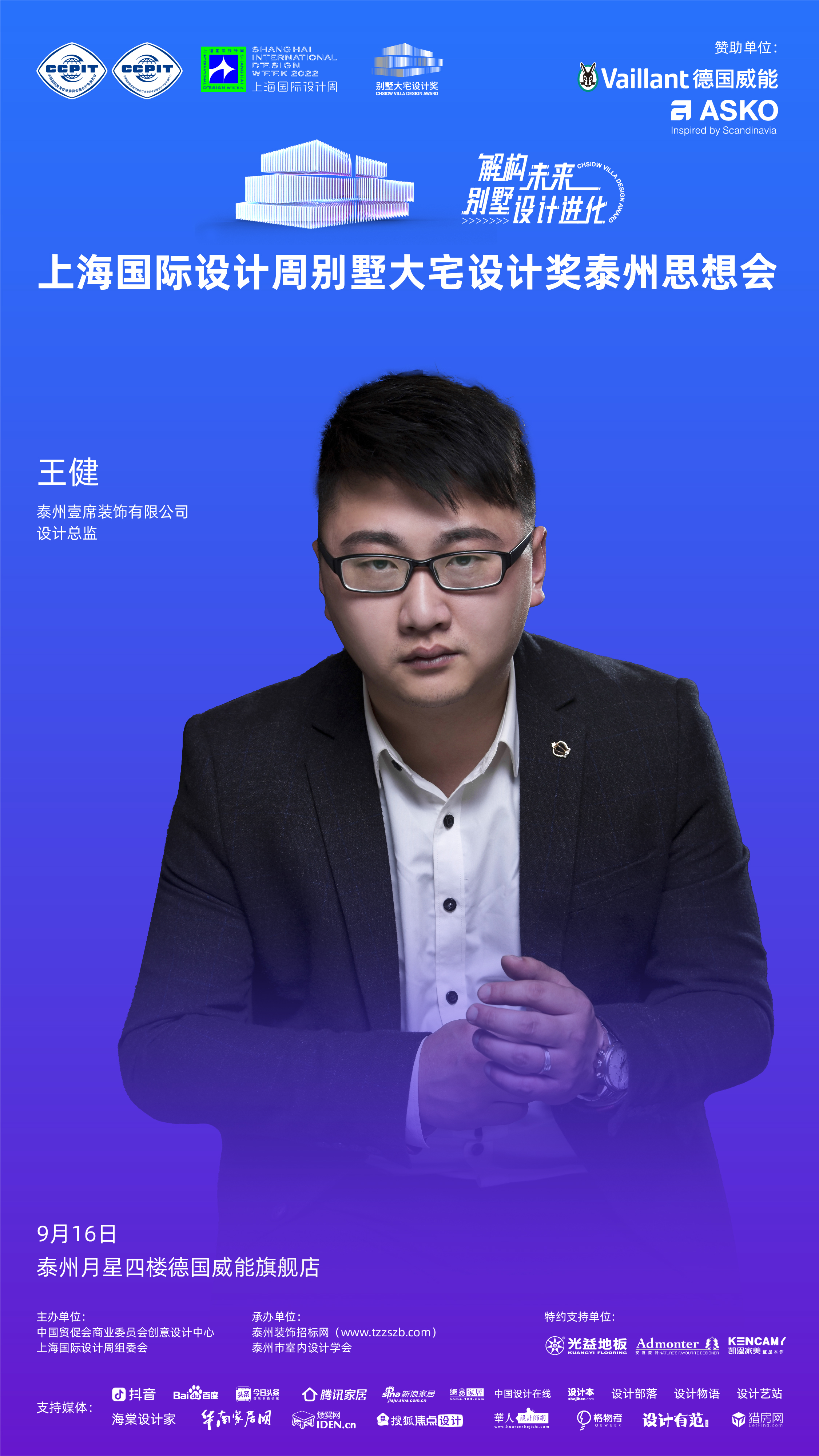 2022年9月16日,「解构未来别墅设计进化」上海国际设计周别墅大宅设计奖泰州思想会将于泰州月星四楼德国威能旗舰店盛大举办!本次活动由中国贸促会商业委员会创意设计中心、上海国际设计周组委会主办,泰州装饰招标网、泰州市室内设计学会承办,德国威能、ASKO赞助,光益地板、安德蒙特、凯恩家美定制特约支持,抖音、百度、今日头条、腾讯家居、新浪家居、网易家居、搜狐焦点设计、中国设计在线、设计本、设计部落、设计物语、设计艺站、海棠设计家、华南家居网、矮凳网、设计有范、猎房网等媒体支持。