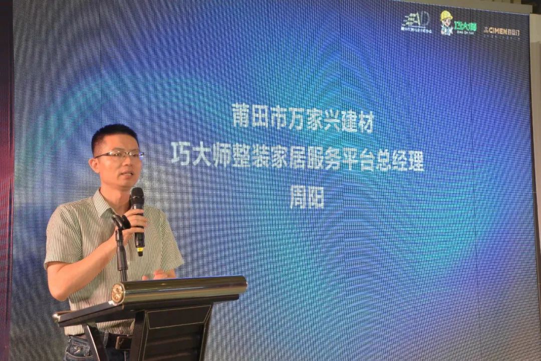 随后,莆田市万家兴建材、巧大师整装家居服务平台总经理周阳致辞。“巧大师”坚持以整合行业内优质资源,打造全方位品质服务为理念,让用户精致工艺、体验极致服务。他表示企业将坚持制造优质产品、凝聚优秀人才、用心为用户打造优质的生活方式。