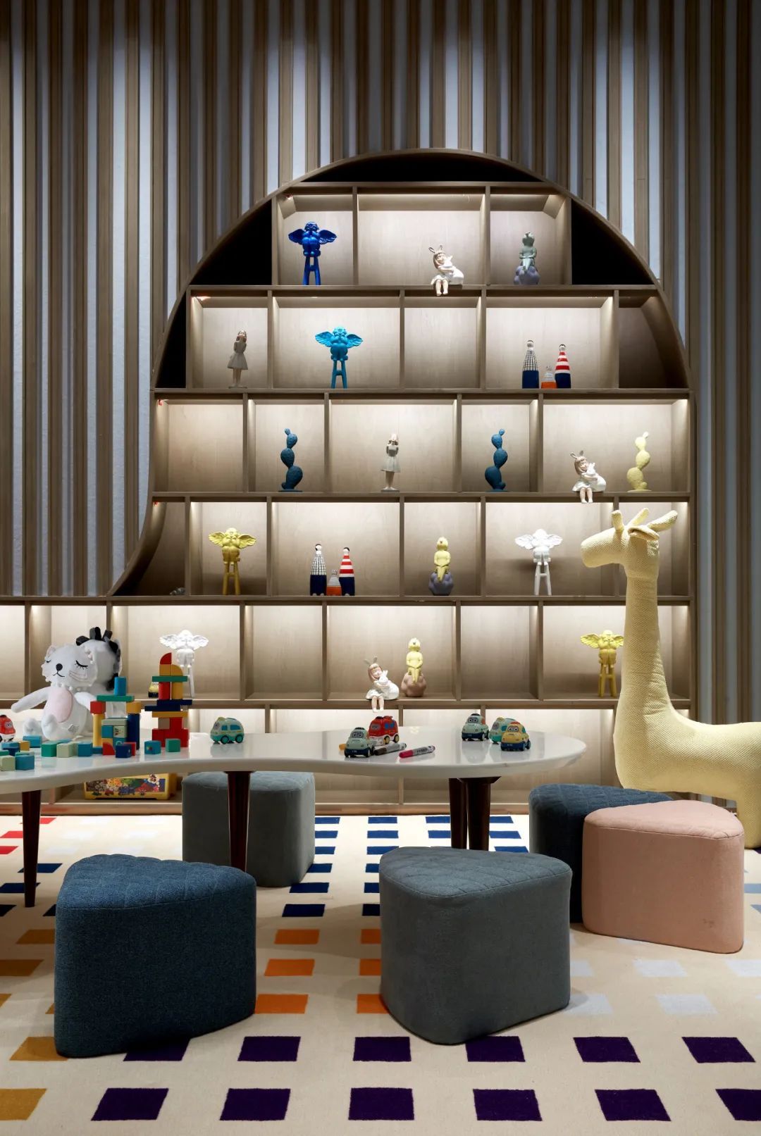 另一边则是充满童趣的儿童乐园,设计师将每一片空间都合理利用,将童年的回忆融入中式风格设计之中,把自然的形态融入空间之中,形成丰富的层次,给人一种井井有条,错落有致的感觉。