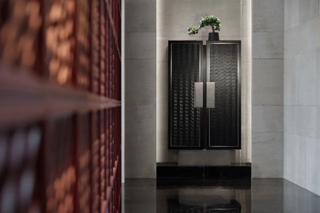 雾霭流岚间看刹那风华,穿过重重掩映的屏风,置身其间,仿如来到另一个世界,风格截然一转,精致的瓷砖铺设在地面与墙壁上,设计师将现代风格与中国传统的水墨画风格相结合,给我们展现出了一幅精美的画卷。